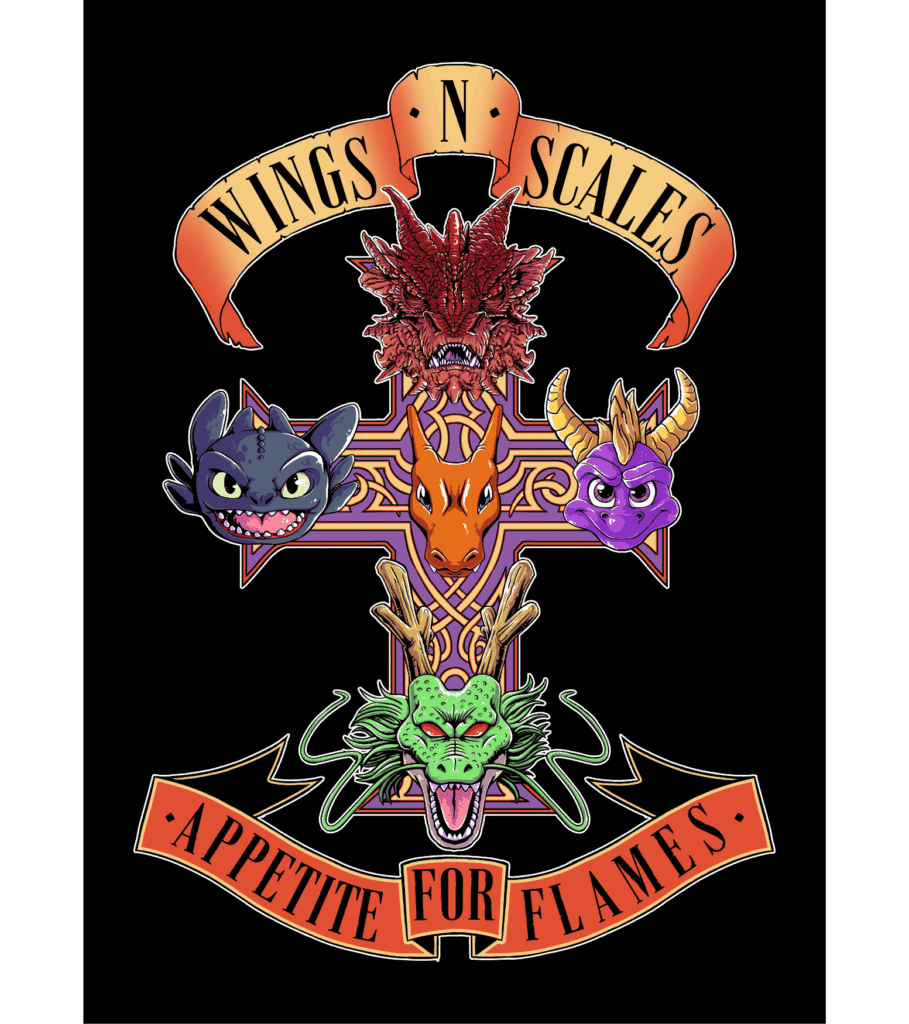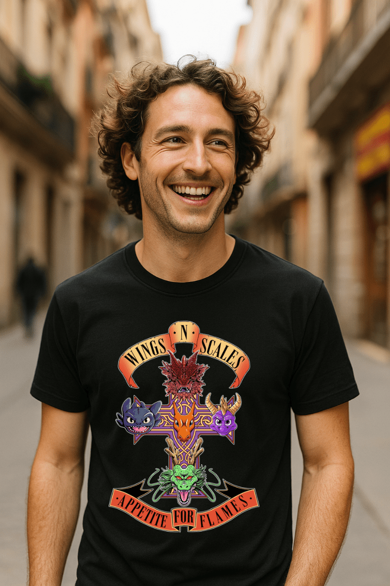 Cinco leyendas aladas de la animación y la fantasía se fusionan en esta oda a las bandas míticas. Si te criaste volando sobre dragones, entrenando con ellos o temiéndolos en tus pesadillas, esta camiseta es tu nuevo uniforme oficial.