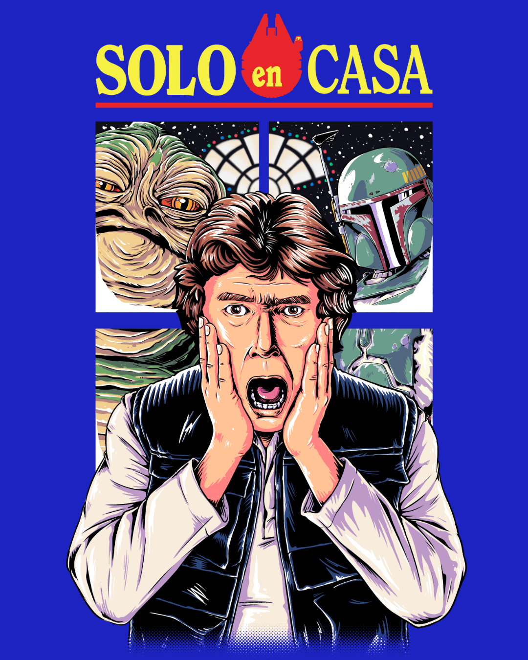 El poster “Solo” reinterpreta de forma brillante a un contrabandista galáctico atrapado en la típica escena de “solo en casa”, pero rodeado de cazarrecompensas y criaturas viscosas.