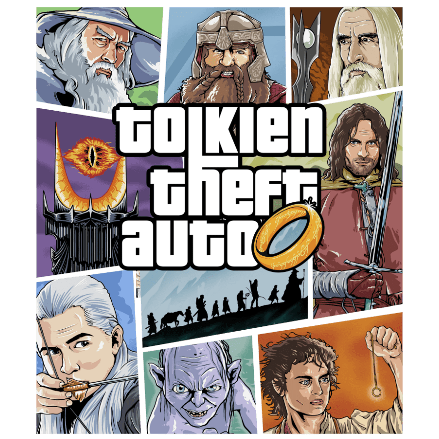 La camiseta Tolkien Theft Auto te lleva directo desde la Comarca a San Andreas, con un diseño exclusivo donde Gandalf, Frodo, Aragorn y compañía se preparan para la misión más épica: ¡sobrevivir a Mordor en modo libre!